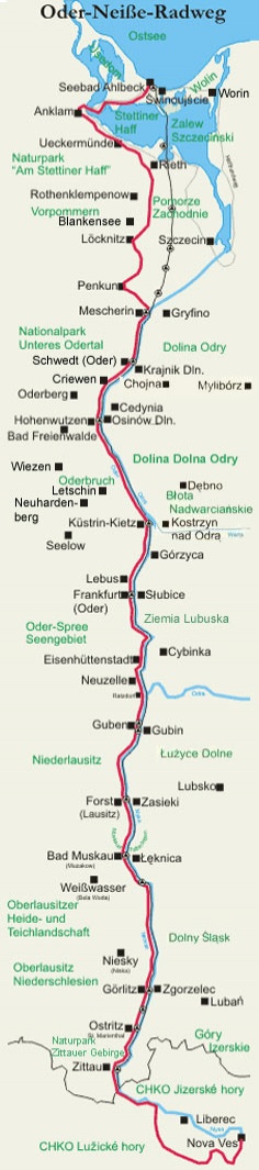 podél Nisy ze Zittau do Bad Muskau. Přátelští lidé, zajímavé historické města a krásná okolní příroda ukazuje, že je cyklotrasa velice pestrá. Zittau a Gorlitz potěší všechny milovníky starých měst. Bad Muskau se pyšní krásným parkem. V Braniborsku, kousek za Guben řeku Nisu vystřídá Odra a krajina změní svůj ráz. Klidná a široká Odra pokračuje na sever do pohraničního města Frankfurtu n.O.. Dále si přijdou na své milovníci přírody, trasa dále pokračuje řídce osídlenou krajinou. Za Oderbruch vede trasa do průmyslového města Schwedt. Poté se dostanete s Odrou na chvíli do Polska. Značená trasa vás pak povede přes Mecklenburg-Vorpommern do Oderhaff. Za Gartzem se opět změní ráz krajiny. Z hrází odbočíte do začátku vlnité a zalesněné krajiny, které pak přechází do rovinatého území. Poté je to již kousek na písčité pobřeží Baltského moře do Štětínskému zálivu, který cyklotrasa objíždí po jeho západním okraji.
