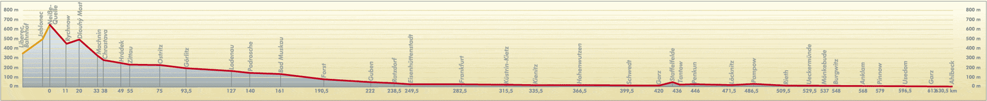 TRASA: Nová Ves nad Nisou - Žitava (Zittau) - Görlitz (Zhořelec) - Bad Muskau - Guben - Frankfurt nad Odrou - Küstrin-Kietz - Hohenwutzen - Penkun - Blankensee - Ueckermünde - Ahlbeck