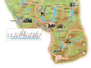 a kulturní mnohotvárností. KLASIFIKACE:Kondice 3, technika 3, zážitek 6, krajina 6 (max.6 bodů) NEJVHODNĚJŠÍ DOBA: Květen - Říjen. V červenci a srpnu je ale ve většině měst hlavní sezóna spojená s velkým provozem na silnicích a obtížným hledáním ubytování. TRASA: Salzburg - St.Lorenz (u Mondsee) - St.Gilgen (u Wolfgangsee) - St.Wolfgang (u Wolfgangsee) - Bad Ischl - Hallstat (u Hallstater See) - Obertraun am Hallstättersee - Bad Ausee - Grundlsee (u Grundlsee) - Bad Mittendorf - Bad Ausee - Altausee (u Altausee) - Bad Ischl - Gmunden (u Traunsee) - Schörfling am Attersee - Attersee am Attersee - Unterach am Attersee - Mondsee (u Mondsee) - Oberhofen am Irsee - Strasswalchen - Mattsee (u Mattsee) - Obertrumer am See - Salzburg REGIONY:Oberösterreich (Horní Rakousko), Salzkamergut (Solná komora), Steiermark (Štýrsko) NAPOJENÍ NA DALŠÍ CYKLOTRASY: Salzburg - Taurská stezka, Mozart radweg, Via Julia radweg, Salz - Seen tour. Bad Mitterndorf - cc a 13 km k Ennské cyklotrase. ZNAČENÍ TRASY: Cesta je značená v obou směrem informačními tabulemi: R 2 (v Horním Rakousku), R 19 s nápisem "Salzkammergut Radweg" (ve Štýrsku), zelené tabule s nápisem "Salzkammergut Radweg" (v Salcburku) PŘEDPISY PRO CYKLISTY: (více) - Rakousko: přilba je povinná pro děti do 12 let PŮJČOVNA KOL: www.oberoesterreich.at/cz/... - Horní Rakousko PŘÍJEZD K JEZERŮM: